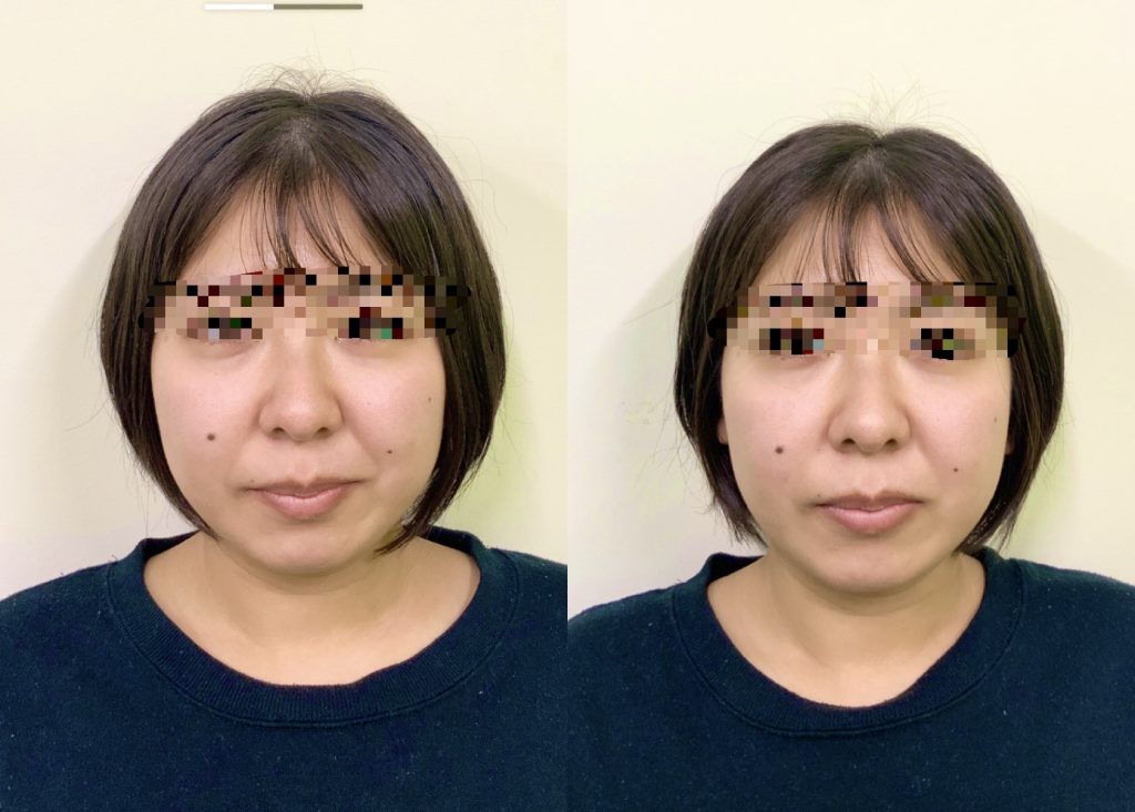 施術前の左の写真と比べて、施術後の右の写真は、目の下の血行が良くなり、全体的に肌も明るくなってます。むくみが取れて、ほほが持ち上がり、ほうれい線が薄くなっているのが分かります。